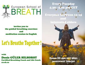 Covid 19 is a virus that resides in the respiratory system and it can be fatal for those with weak immune systems, we all know about it. But what most of us did not realize for so long, is what that tiny virus made us learn the hard way how vital breath is, how much it can affect the quality of our lives, and how vulnerable we can become just by breathing or not being able to breathe. Especially in these days, that we are locked-down in our homes and experiencing different challenges ‘inside’, as well as ‘outside’, ‘breathwork’ is a great tool to relax and reenergize both our bodies and minds…Therefore we are very happy to offer these very special breathing sessions to the community, where young people between 11-15 and all interested elders can enjoy. While having fun, they acquire breathing tools, techniques and habits that they can benefit all their lives. This is a free event of European School of Breath.