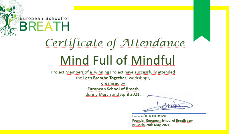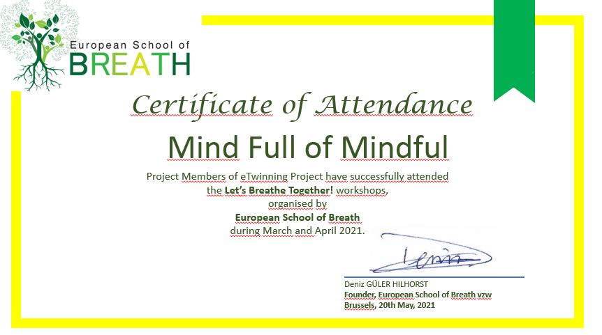 And as European School of Breath, we supported them in their project. We organised various Let’s Breathe Together! workshops, with teachers only and with kids&teachers. The project students also joined our 11th April, World Breathing Day Free Online Let’s Breathe Together! workshop. The project ended in May 2021. We are so happy and proud to present our 120 Certificates to the kids and the teachers of Mind Full of Mindful Project for participating our online Let’s Breathe Together! workshops during March and April 2021!